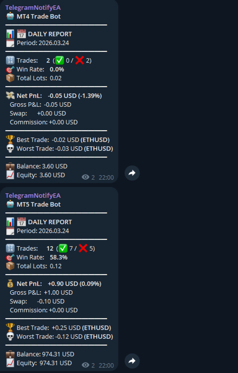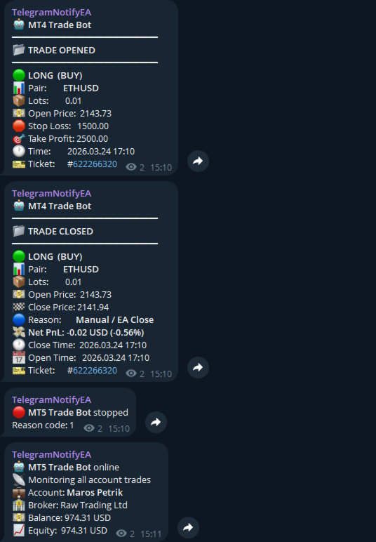 Bu Expert Advisor, MT4 hesabınızda herhangi bir işlem açıldığı veya kapandığı anda Telegram’a (özel sohbet, grup veya kanal) net ve güzel formatlanmış mesajlar gönderir. Ayrıca isteğe bağlı günlük, haftalık ve aylık performans raporları da otomatik olarak iletir.