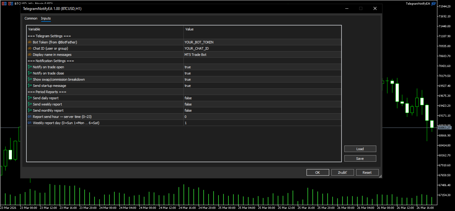 Hiç kod yazmanıza gerek yok. Sadece bir Telegram botu oluşturun, Chat ID’nizi alın, her ikisini de EA ayarlarına yapıştırın, https: // api.telegram. org için WebRequest izni verin ve hazır olun.