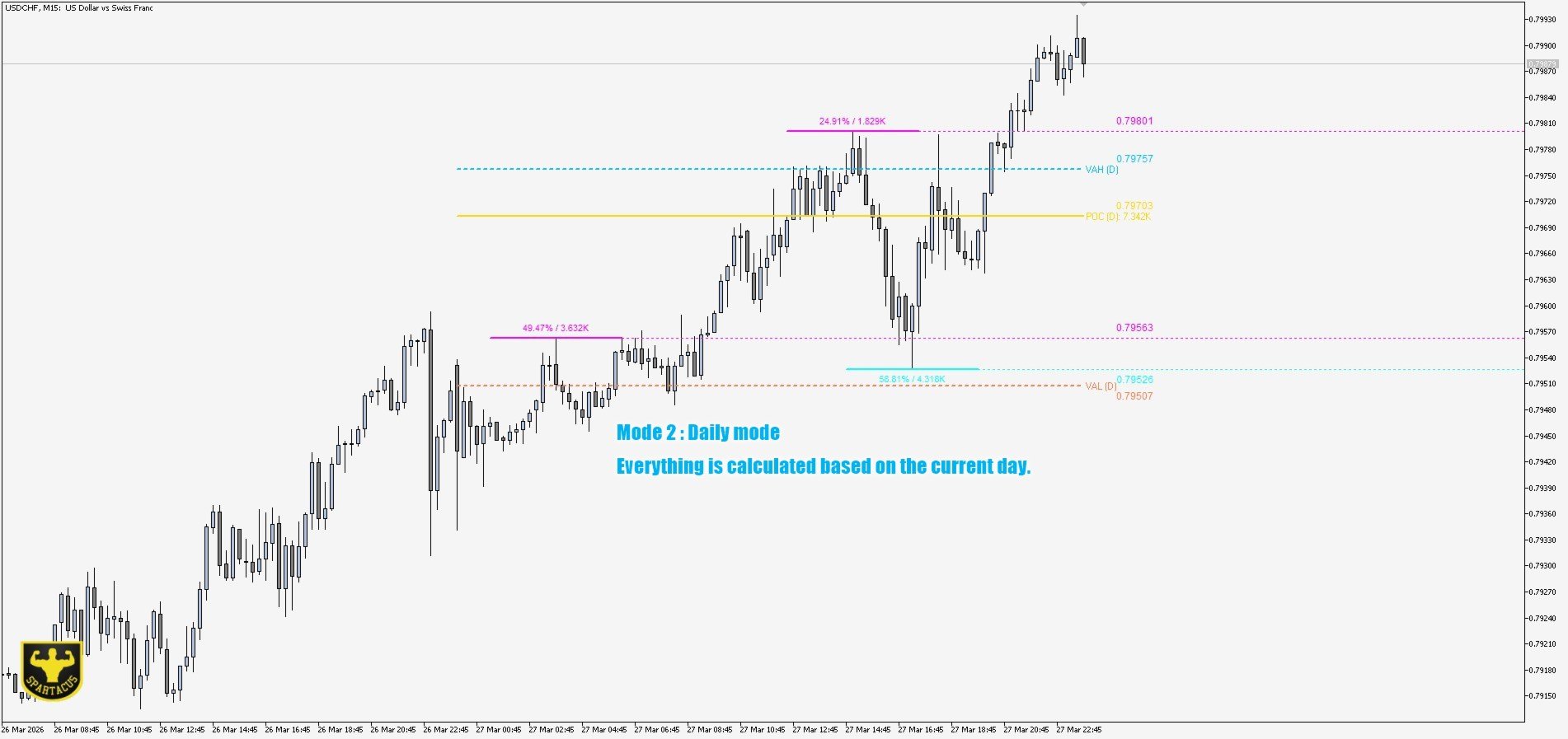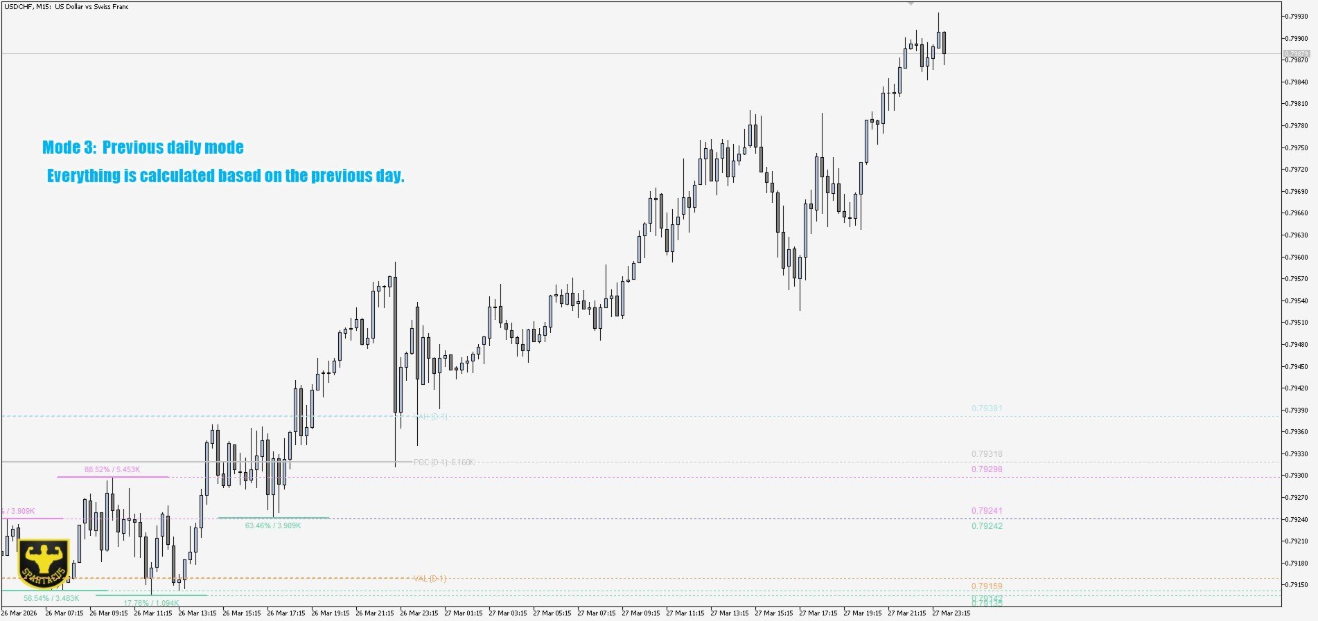 - Previous Day Modu — D-1 seansının profili, noktalı çizgilerle mevcut güne kadar uzatılarak gösterilir. Bugün hâlâ geçerli olan dünün kilit seviyelerini tespit etmek için vazgeçilmezdir.