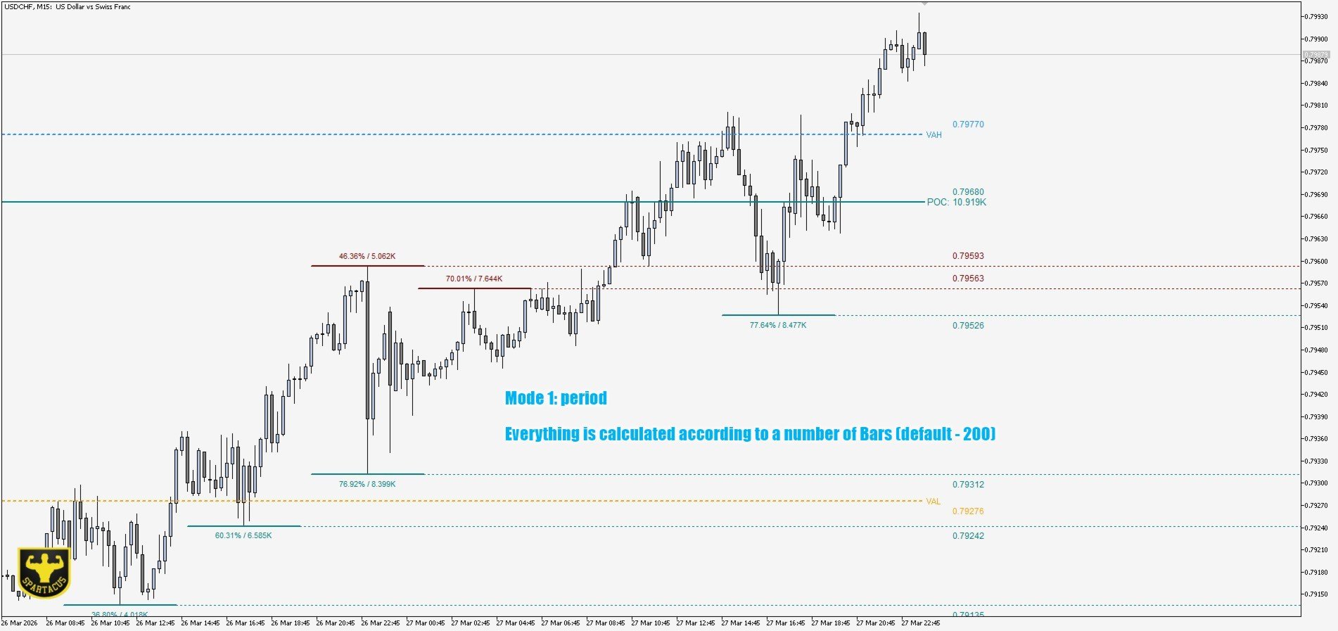 - Period Modu — Yapılandırılabilir sayıda mum üzerinden hesaplanan hacim profili (varsayılan 200). Swing trading ve gün içi analiz için idealdir.