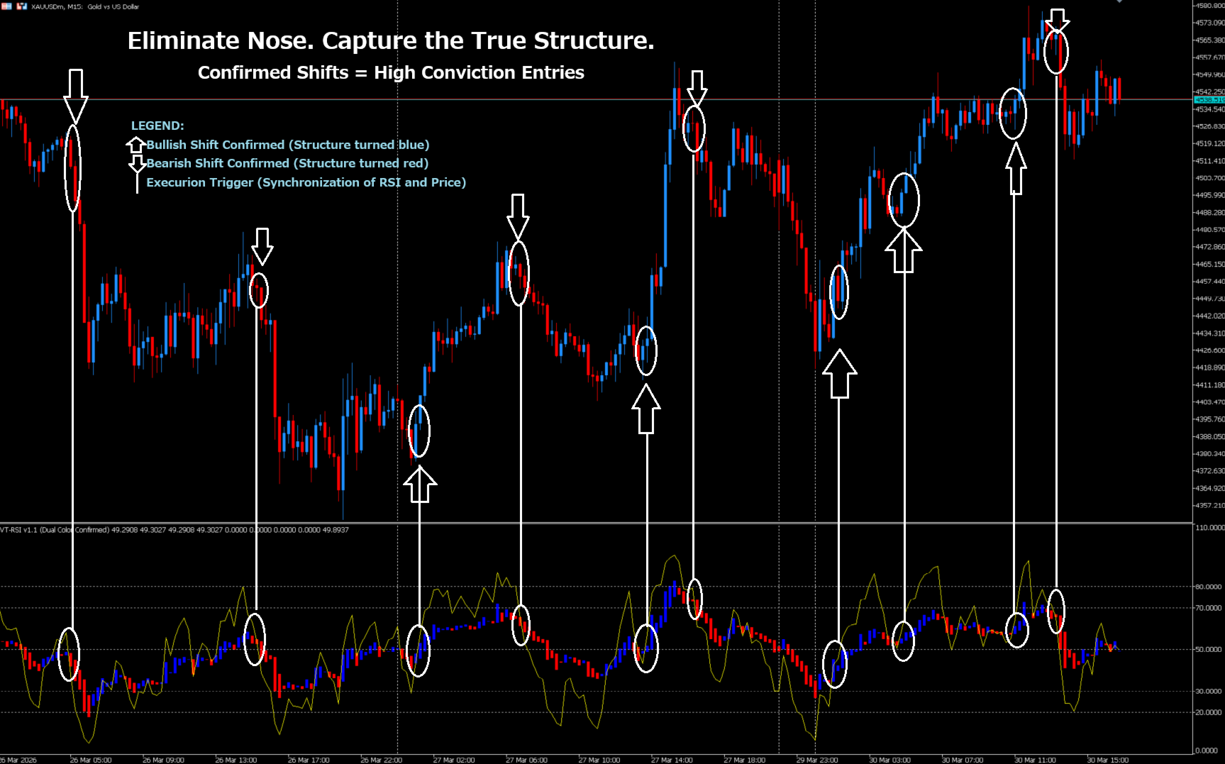 Wait for the Pullback: In a bullish trend, wait for M15 VT-RSI to temporarily turn Red.