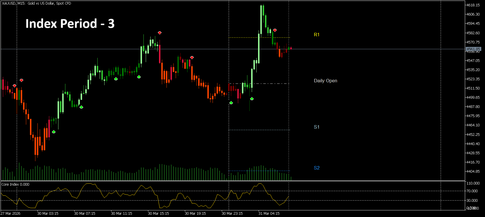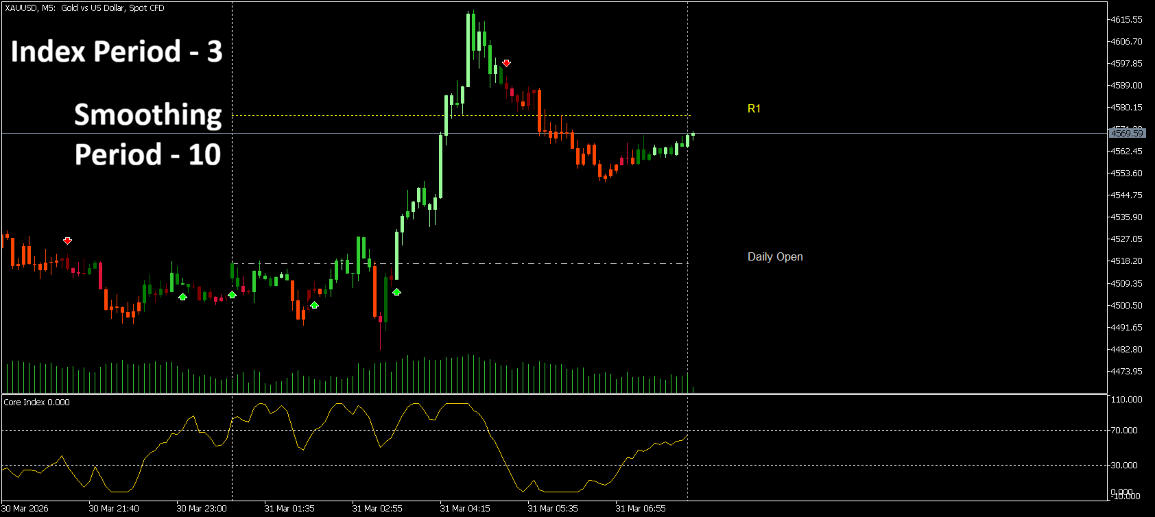 For best results, use Core Index in trending or active market conditions. It can be applied across multiple timeframes, but performs best when aligned with overall market direction or combined with basic structure (support/resistance or trend bias).