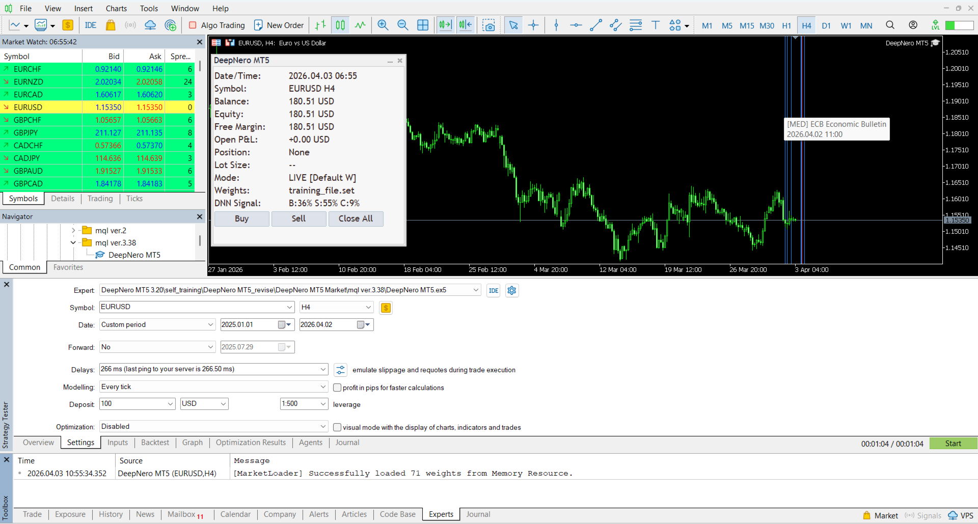 DeepNero MT5 is an advanced Expert Advisor operating on a native Deep Neural Network (DNN) architecture.