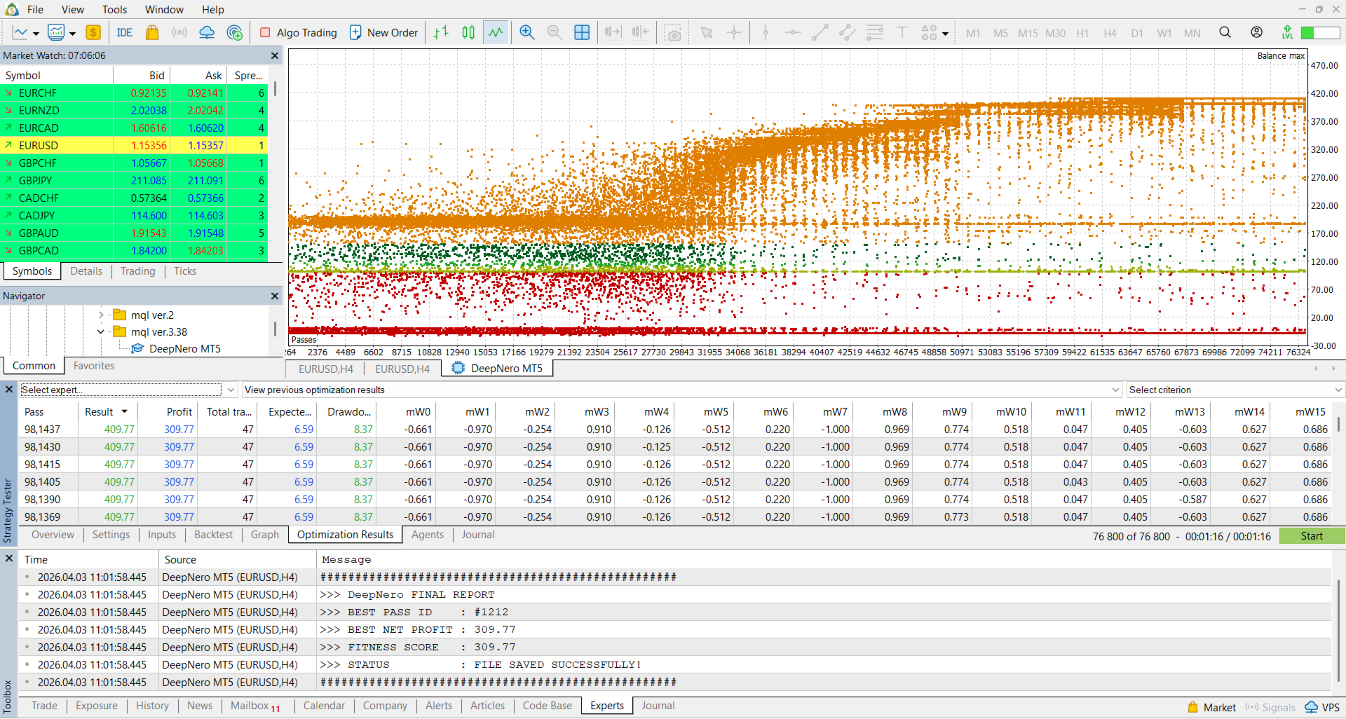 A core advantage of DeepNero MT5 is its built-in "One-Click Neural Optimization" system. Users can train and adapt the neural network directly inside the MetaTrader 5 Strategy Tester. By utilizing genetic algorithms, the EA will automatically extract the optimal memory weights and save them for your specific broker, symbol, and timeframe.