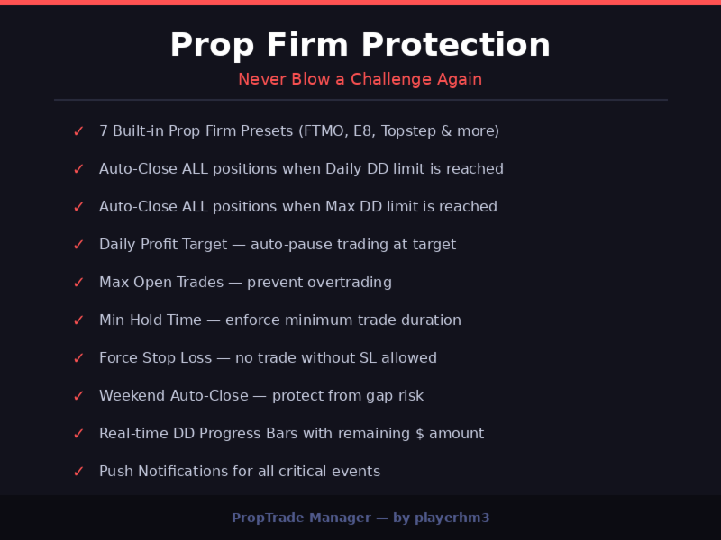 • 7 Built-in Presets: FTMO, MyForexFunds, The Funded Trader, True Forex Funds, E8 Funding, Topstep + Custom