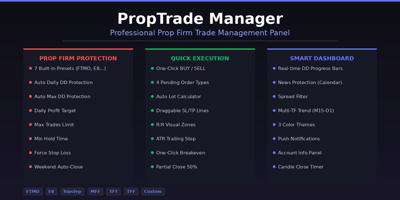 Tags: prop firm, trade panel, trade manager, risk management, FTMO, drawdown protection, news filter, trailing stop, breakeven, partial close, one-click trading, position size calculator, prop firm challenge, funded trader