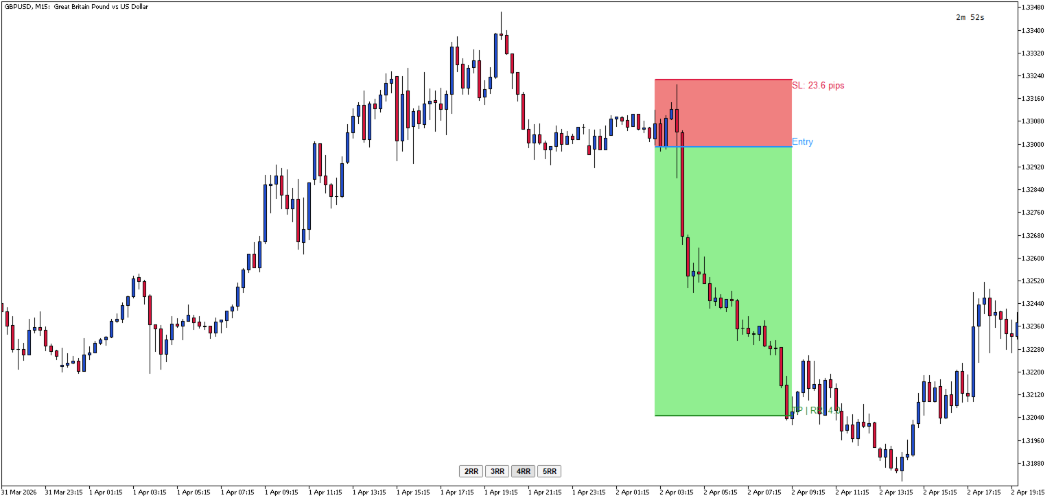 - Use the 2RR, 3RR, 4RR, or 5RR buttons to quickly set your take profit at a specific risk-reward ratio or manually drag the TP to the required price