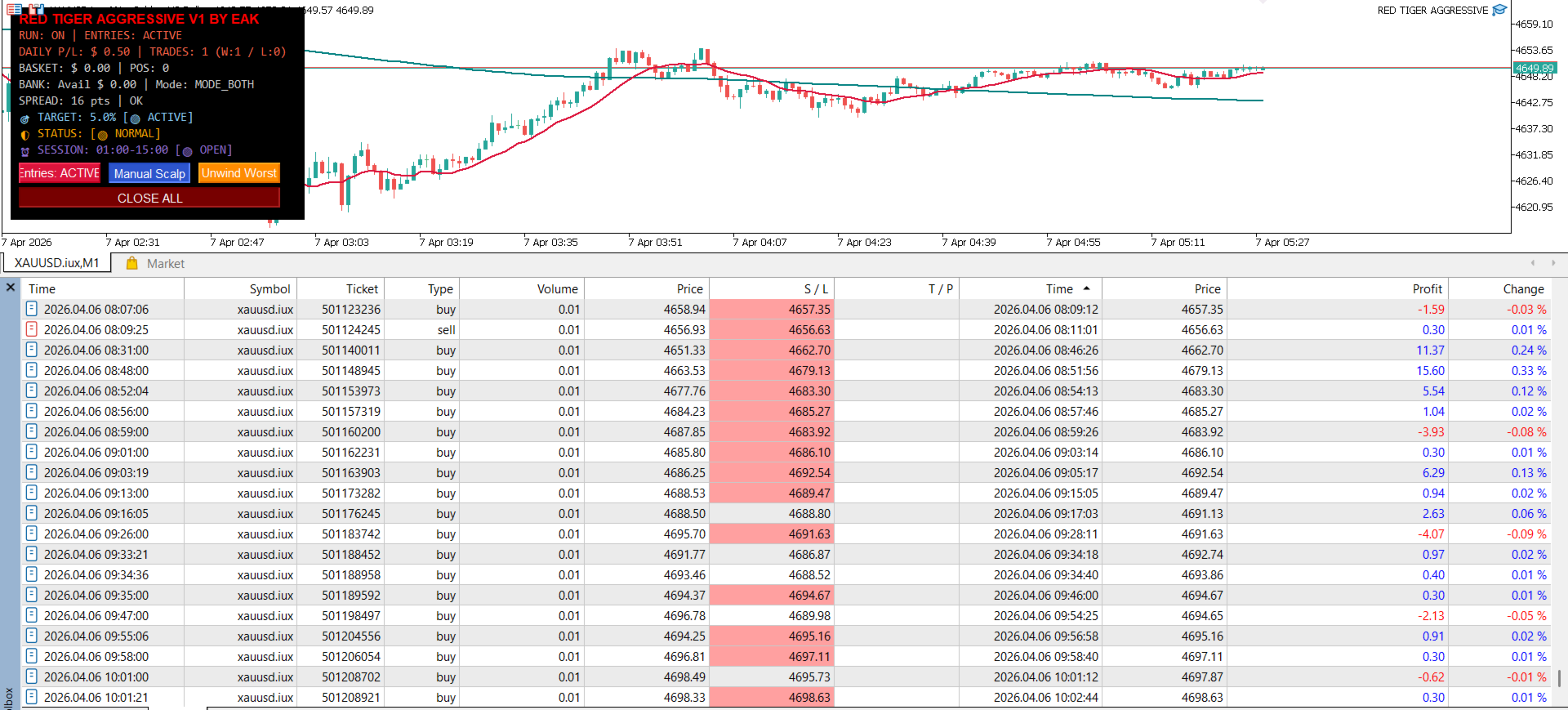 🎛️ Fully Interactive On-Chart Dashboard: Control the EA seamlessly with a single click. Pause entries, execute manual scalps, force unwind worst trades, or hit the emergency Close All button directly from your chart.