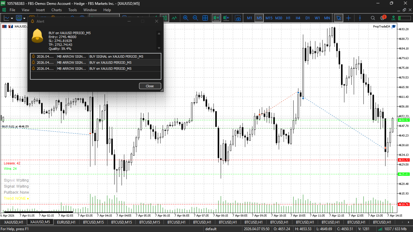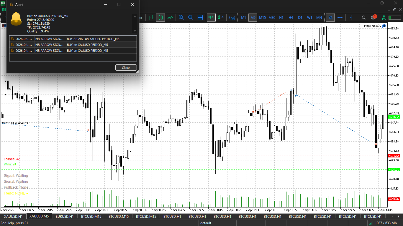 MV Phantom Pullback Pro is a professional, non-repaining MT5 indicator that identifies high-probability pullback entries within established trends. It combines multi-timeframe analysis, signal quality scoring, built-in risk management, and performance tracking in a single solution.