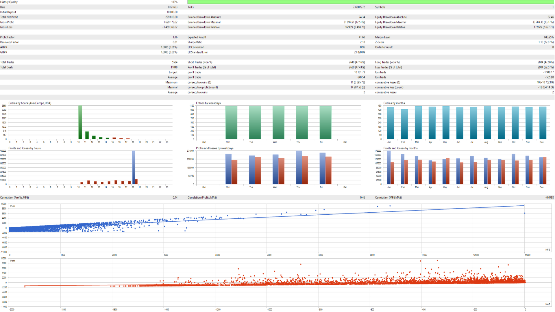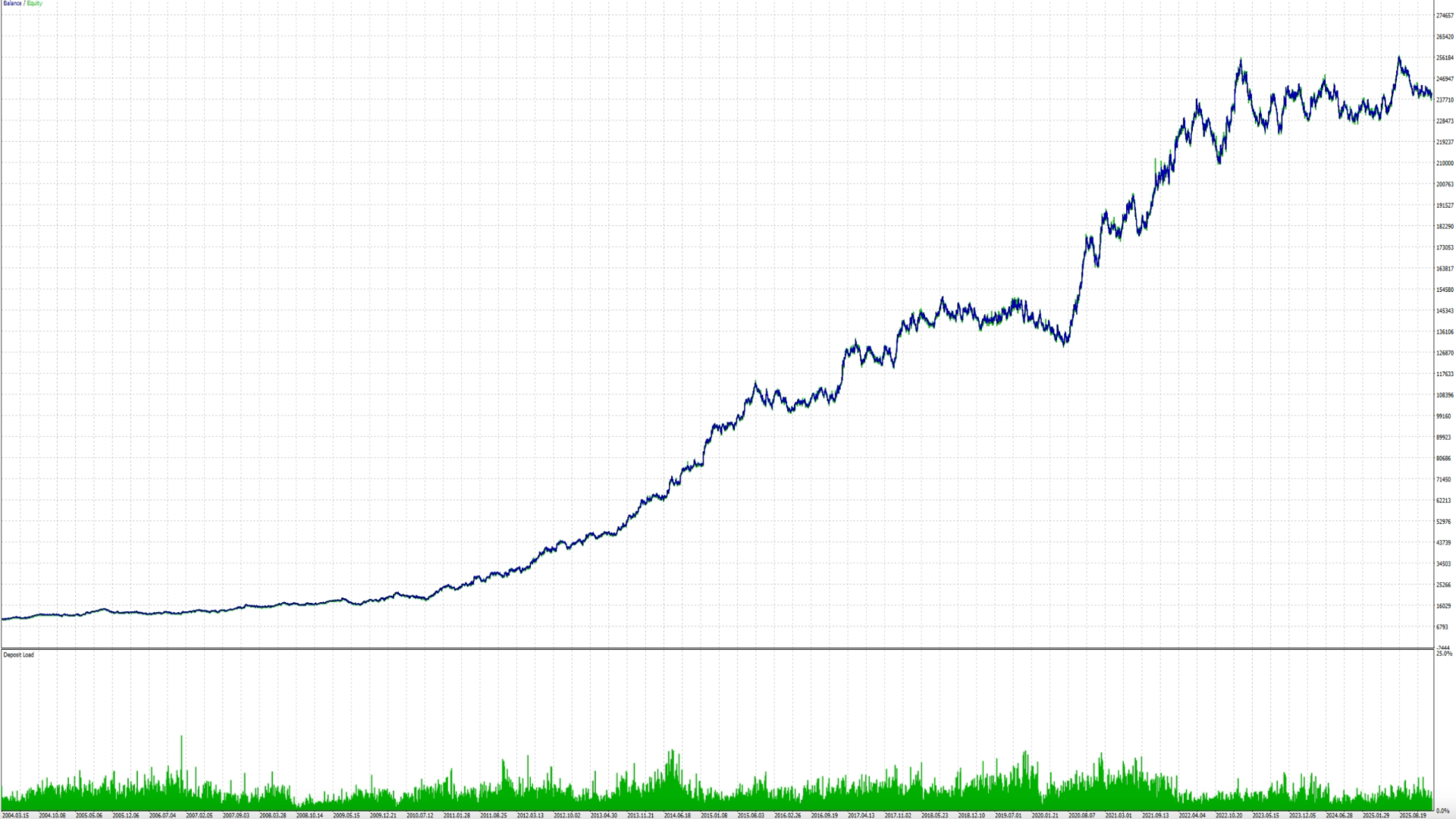 Strateji, gerçek ve demo hesaplarda test edilmiş ve MetaTrader 5 platformunda Dukascopy Bank piyasa verileri (swap, spread ve gecikmeler dahil) kullanılarak kapsamlı şekilde optimize edilmiştir.