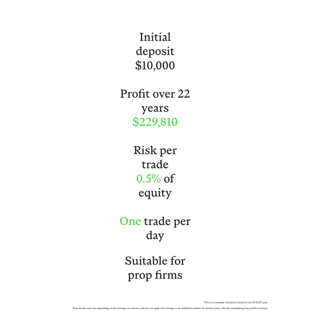Bu, EUR/JPY paritesine dayalı bir örnektir. Sonuçlar, seçtiğiniz ayarlara bağlı olarak değişebilir. Strateji sınırsız sayıda döviz çiftine uygulanabilir.