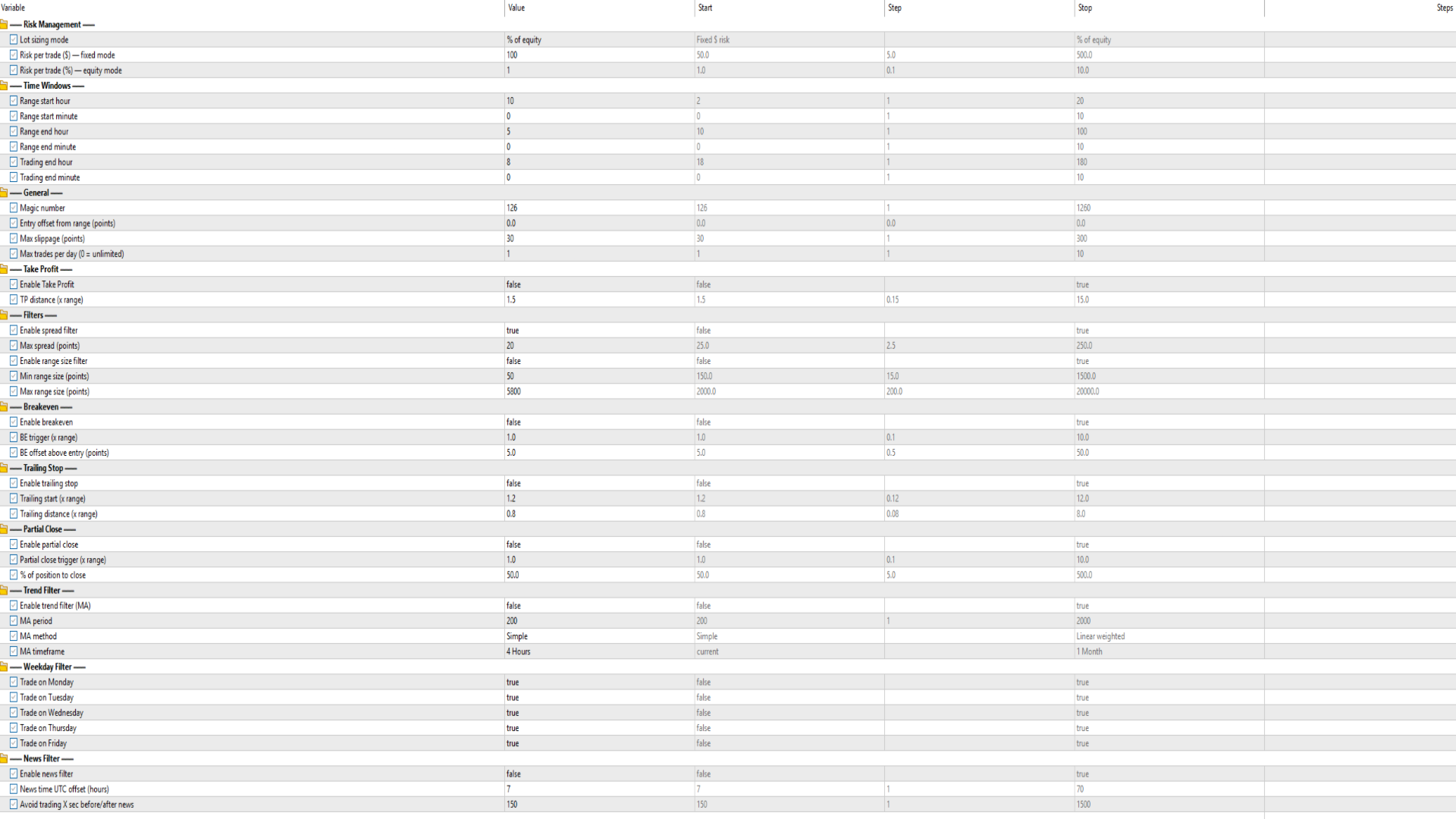 Düşük kaliteli işlemlerden kaçınmak için EA birkaç yerleşik filtre içerir. Spread, aralık boyutu, haftanın günü, trend yönü ve hatta önemli haber olaylarına göre işlem kısıtlanabilir. Bu da sistemi sadece backtest için değil, gerçek işlem için de çok daha kullanışlı hale getirir.