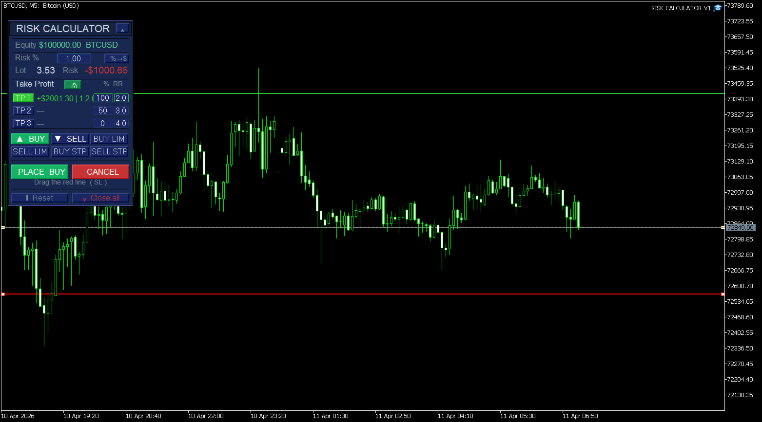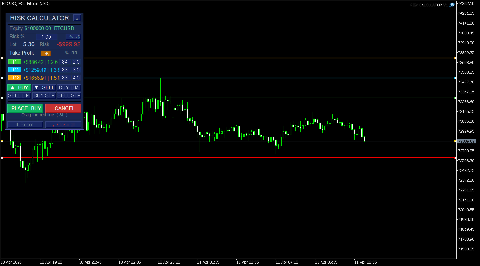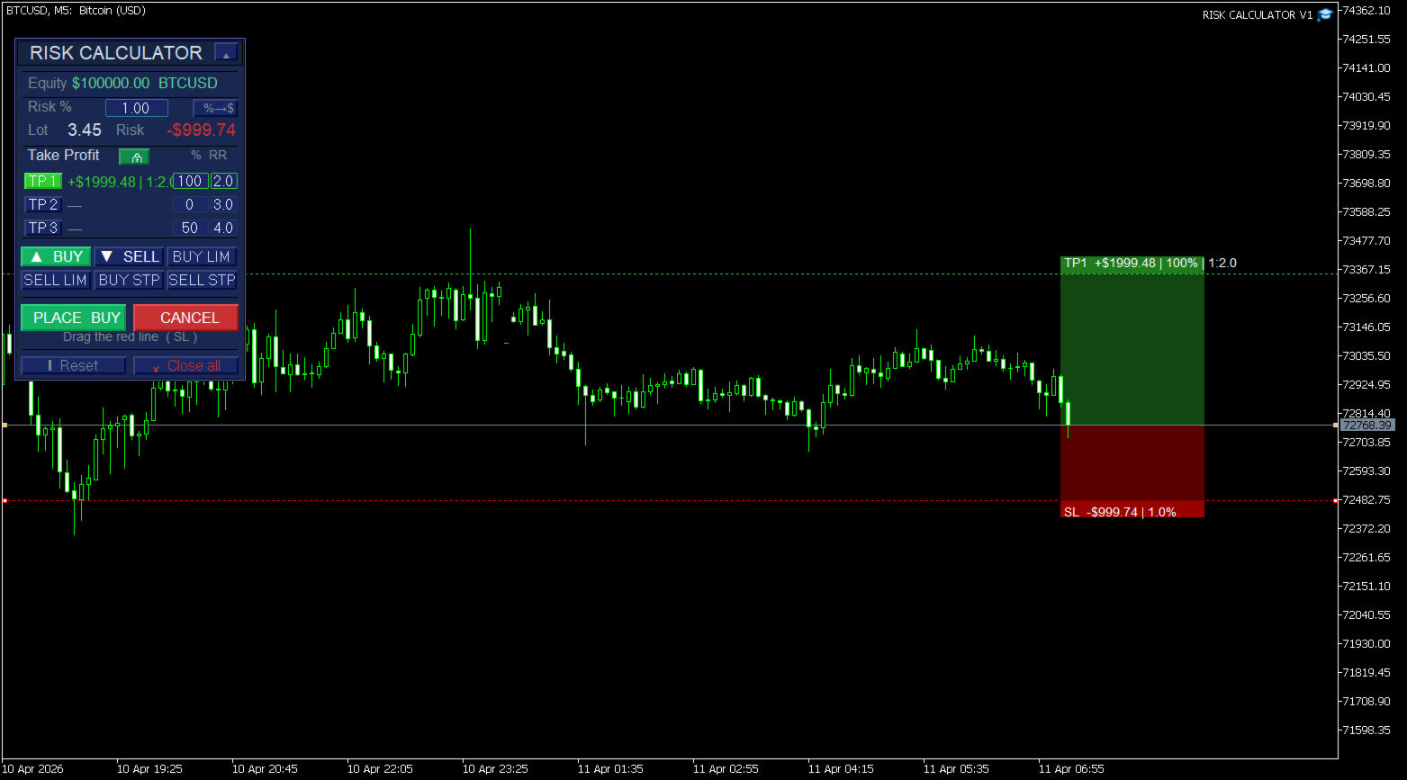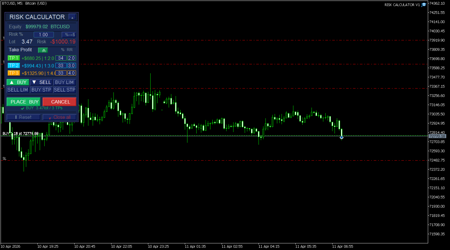 • Automatic lot calculation based on risk percentage or fixed dollar amount