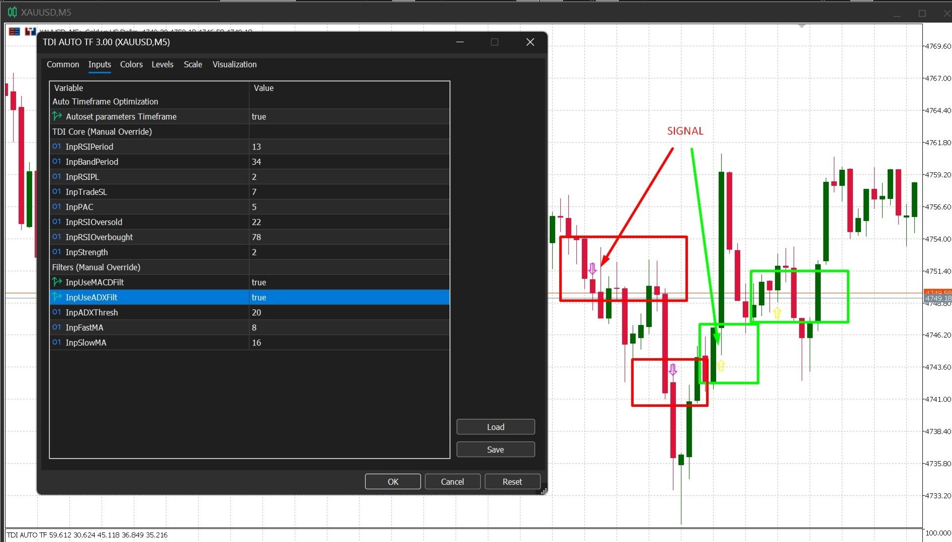 TDI Optimized by Marsu is a super indicator developed specifically for the MetaTrader 5 (MT5) platform. Upgraded from the classic Traders Dynamic Index (TDI) system, this version brings a fresh perspective with its excellent noise signal removal capabilities, direct optimization on Japanese candlesticks (lighter and smoother), and especially its Auto Timeframe system that automatically adapts to all trading styles.