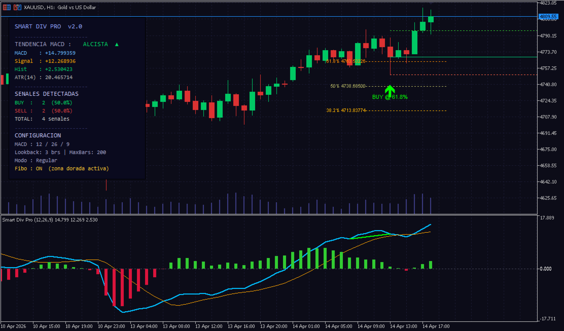 Smart Div Pro is an advanced MACD divergence indicator designed for traders seeking a clear technical edge by combining three powerful tools: MACD Divergences, Fibonacci Retracements, and a real-time Information Panel.