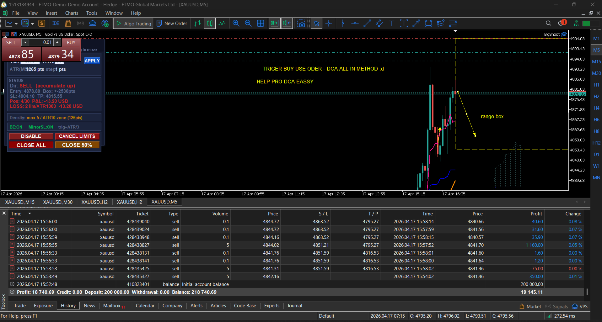 It serves as a specialized utility for accumulation trading strategies, helping traders gradually build positions using a DCA (Dollar-Cost Averaging) approach. The EA enables precise scaling with small entries, allowing you to capture more favorable price zones over time.