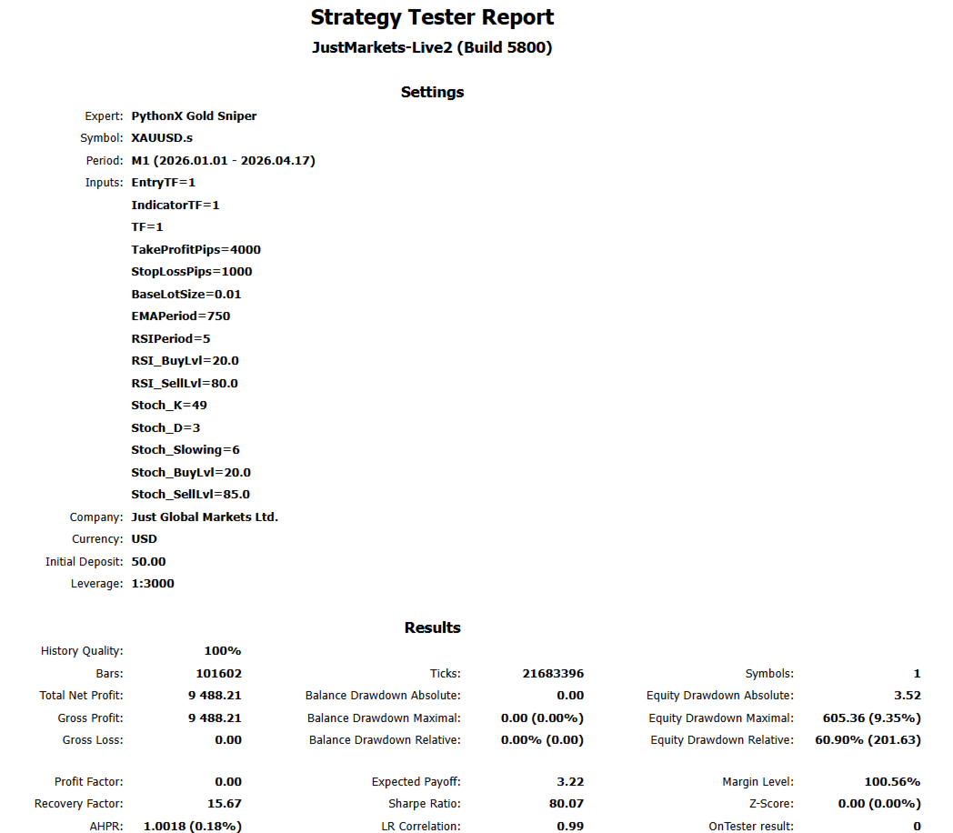PythonX Gold Sniper is a high-precision Expert Advisor designed specifically for XAUUSD on the M1 timeframe. The system focuses on capturing short-term momentum reversals with strict confirmation logic, combining trend alignment with oscillator-based timing.