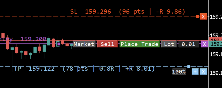 - Sürükle ayarla — Giriş, SL ve TP seviyelerini grafikte taşı; lot, risk, kâr ve R:R anlık güncellenir