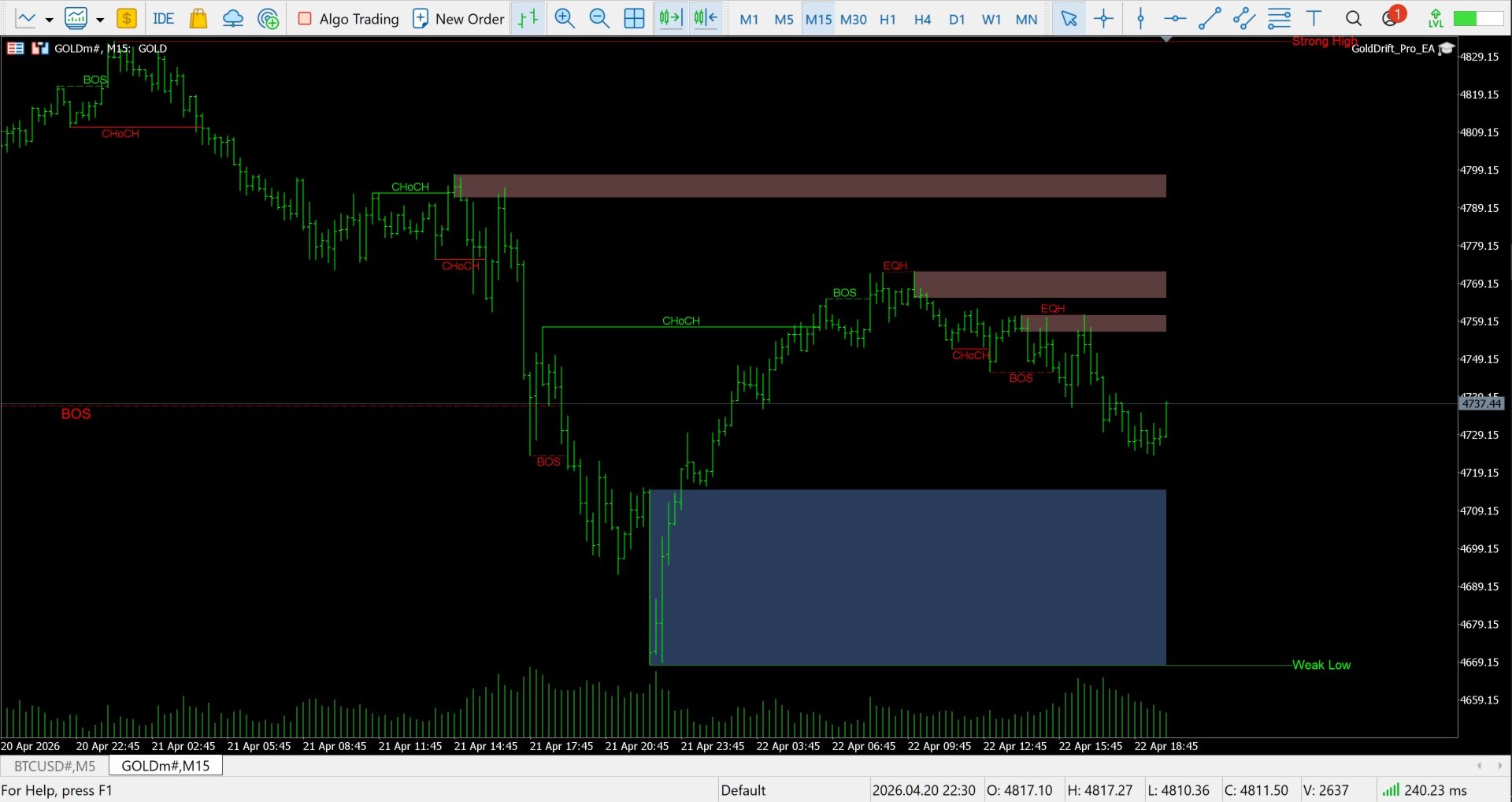 GoldDrift Pro includes a complete Wyckoff market structure overlay directly on your chart: