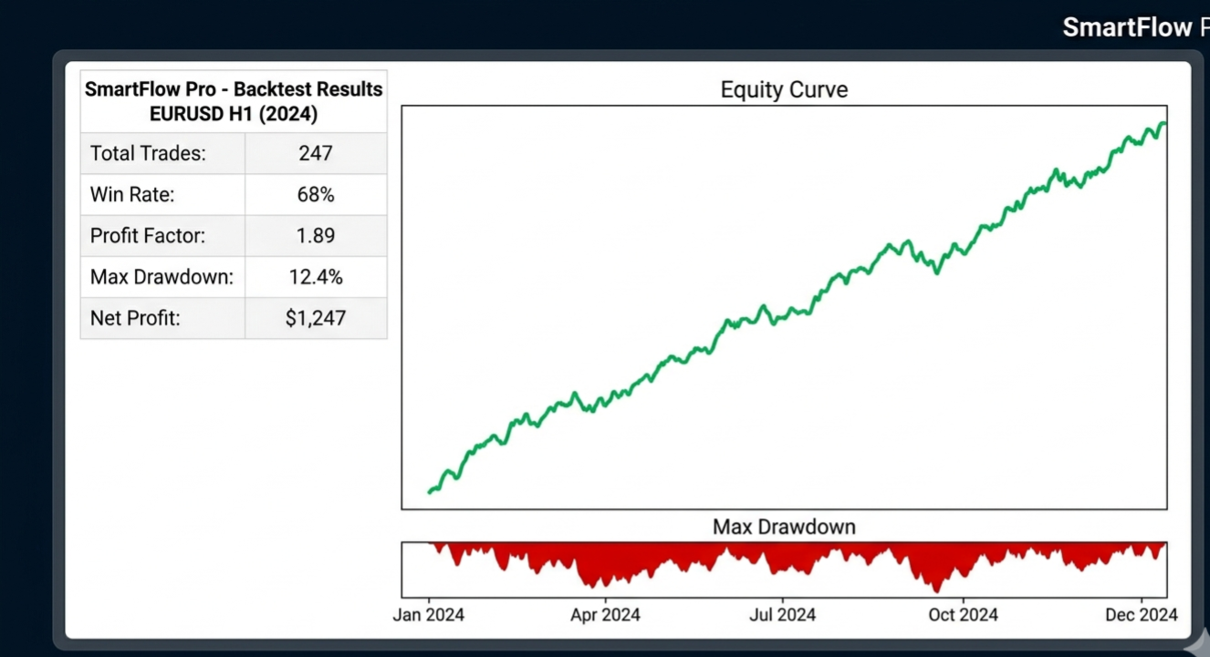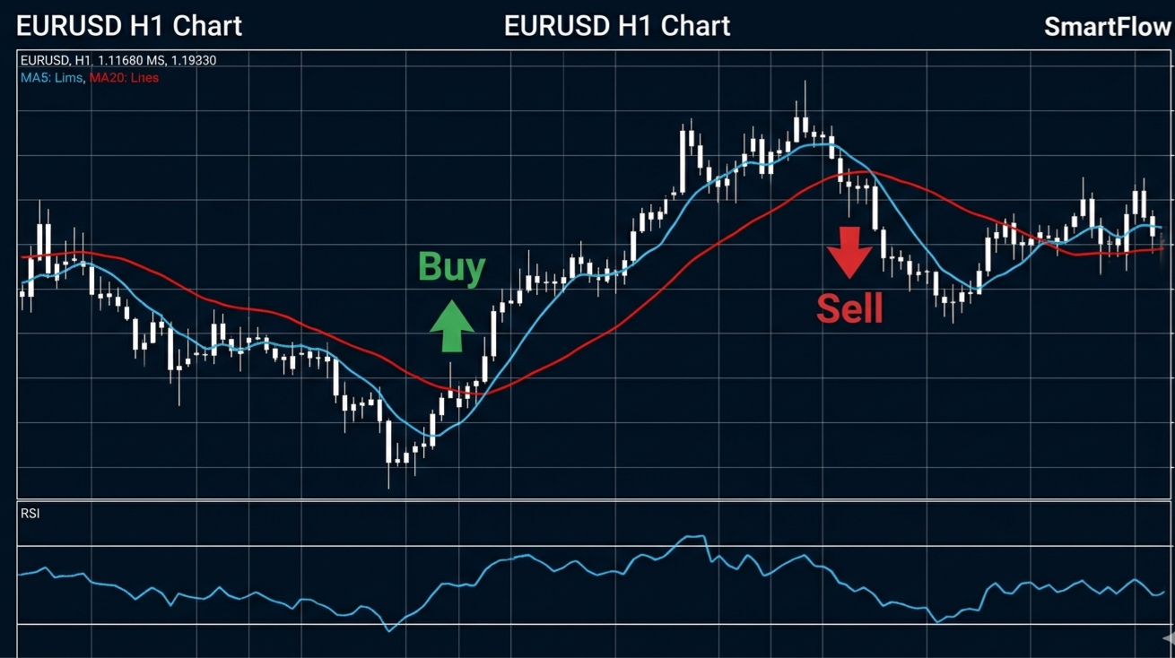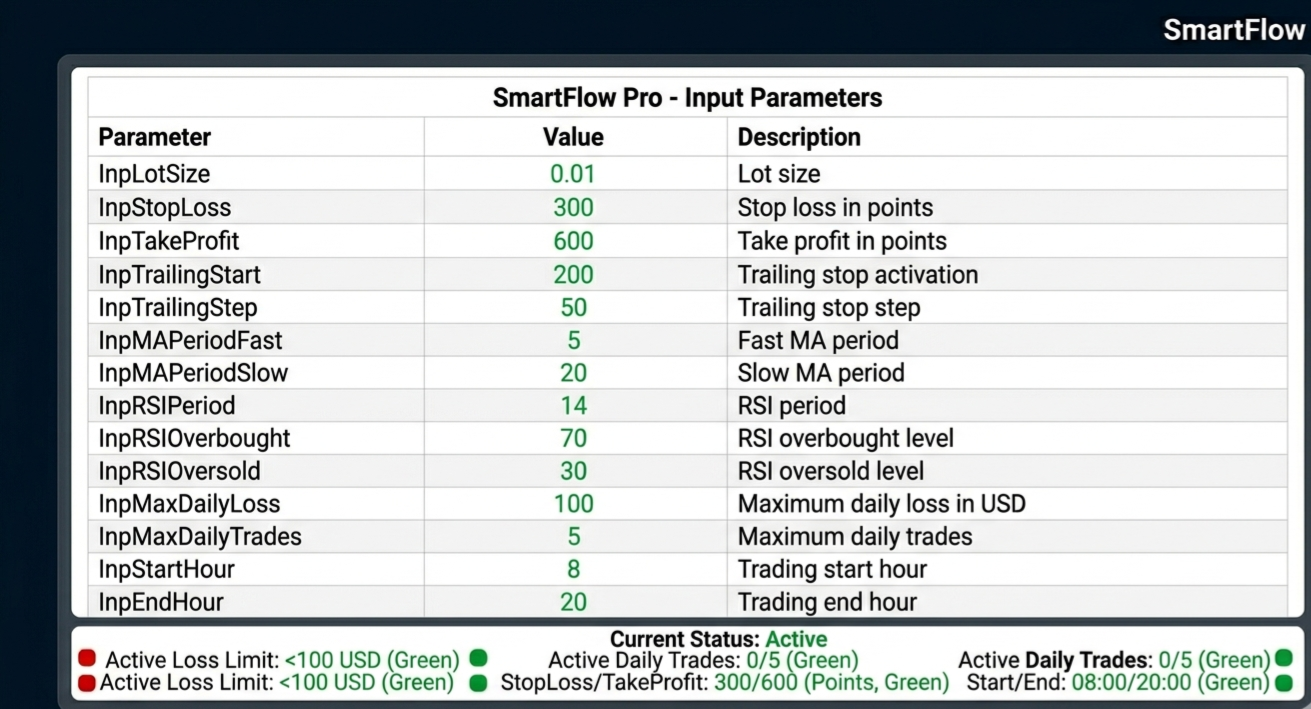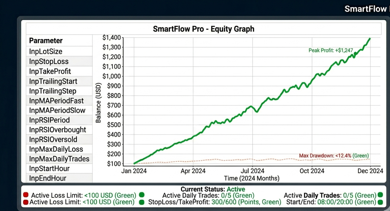 SmartFlow Pro 2, M15 zaman diliminde yüksek olasılıklı işlemler için Hareketli Ortalama geçişlerini RSI filtreleriyle birleştiren profesyonel bir Uzman Danışmandır.