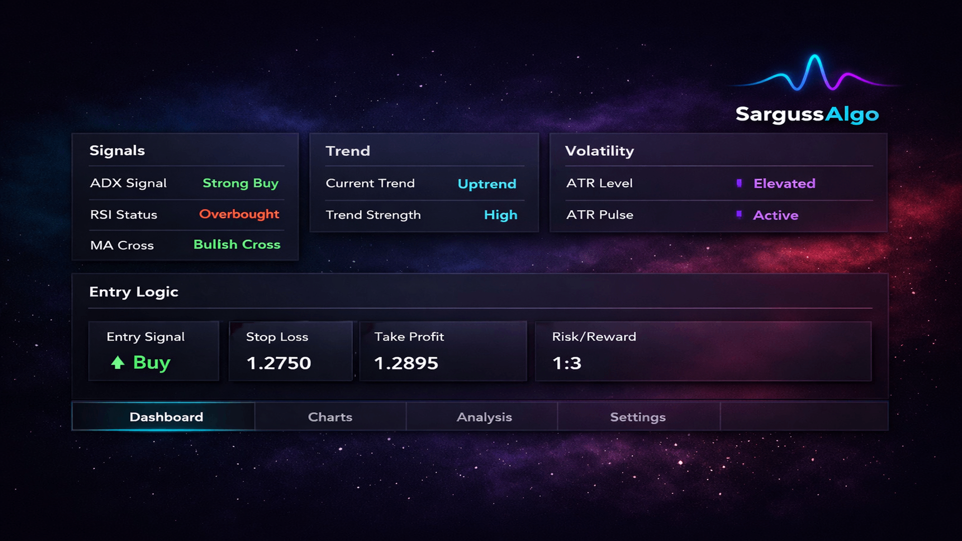 Shows trend direction, volatility level, RSI state, MA cross, ATR pulse and entry logic. Designed for fast decision‑making.