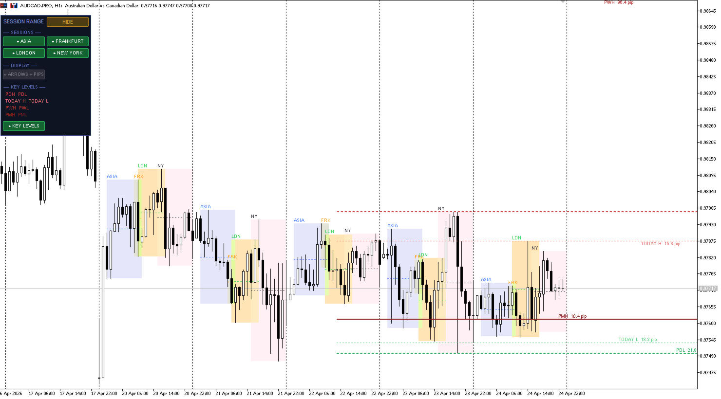 SessionsScope draws all of it for you — clean colored boxes for each session, live range measurement in pips, and a complete set of daily, weekly, and monthly reference levels — all updated automatically as the market moves.