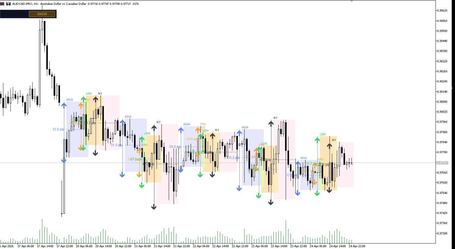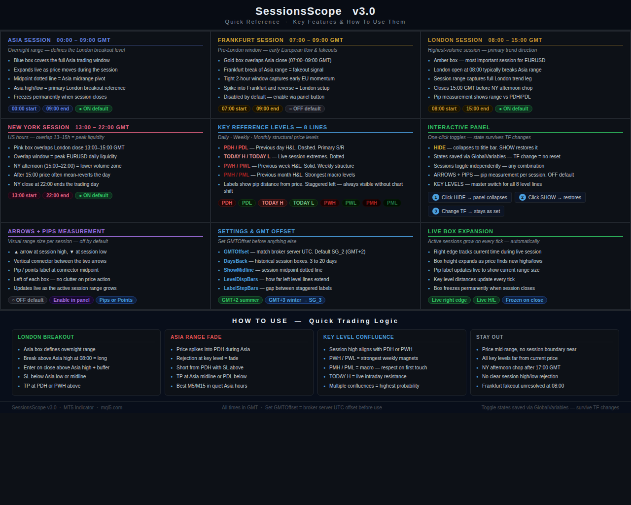SessionsScope is a professional trading indicator for MetaTrader 5 that maps every major trading session directly onto your chart — and tells you, at a glance, exactly where each session started, ended, and how far price moved inside it.