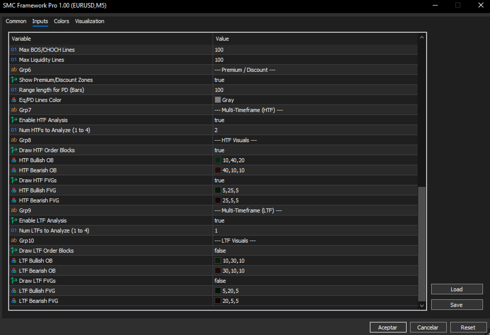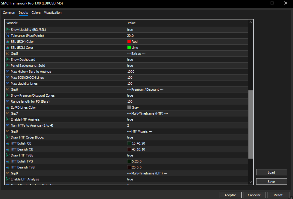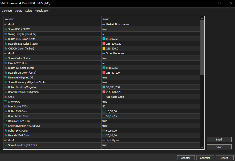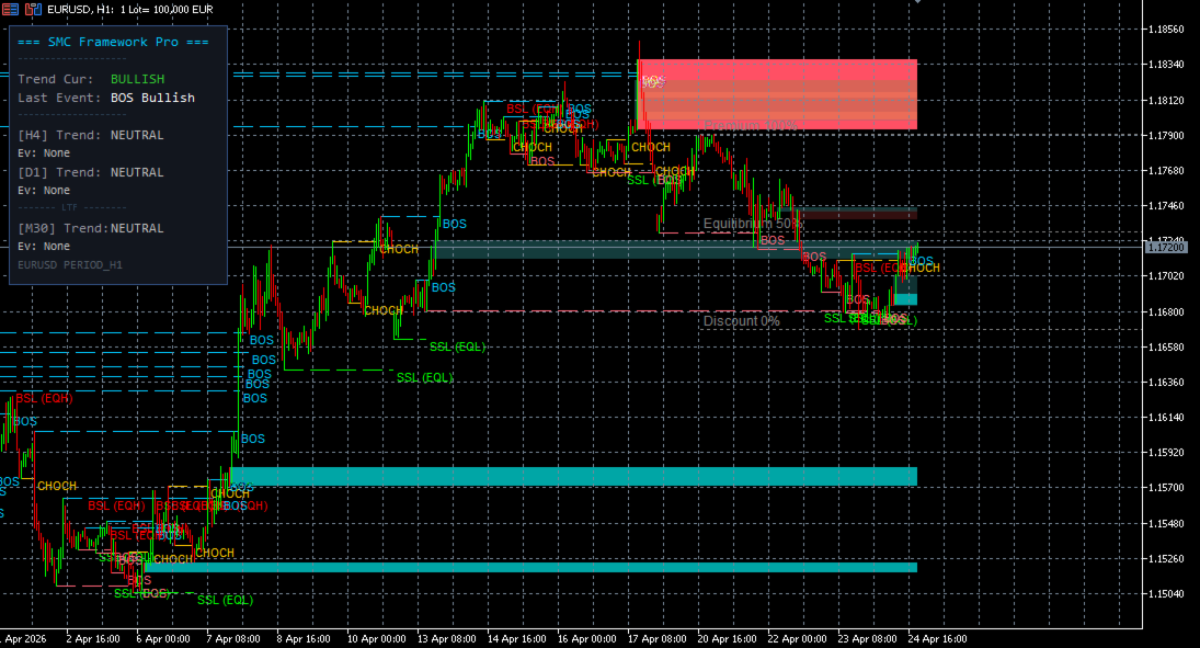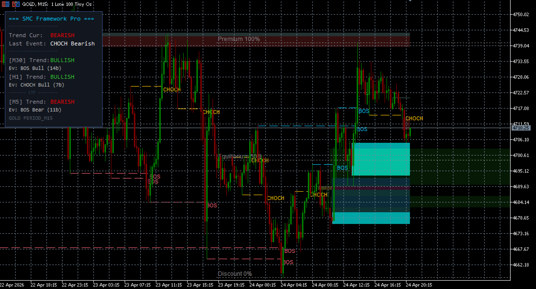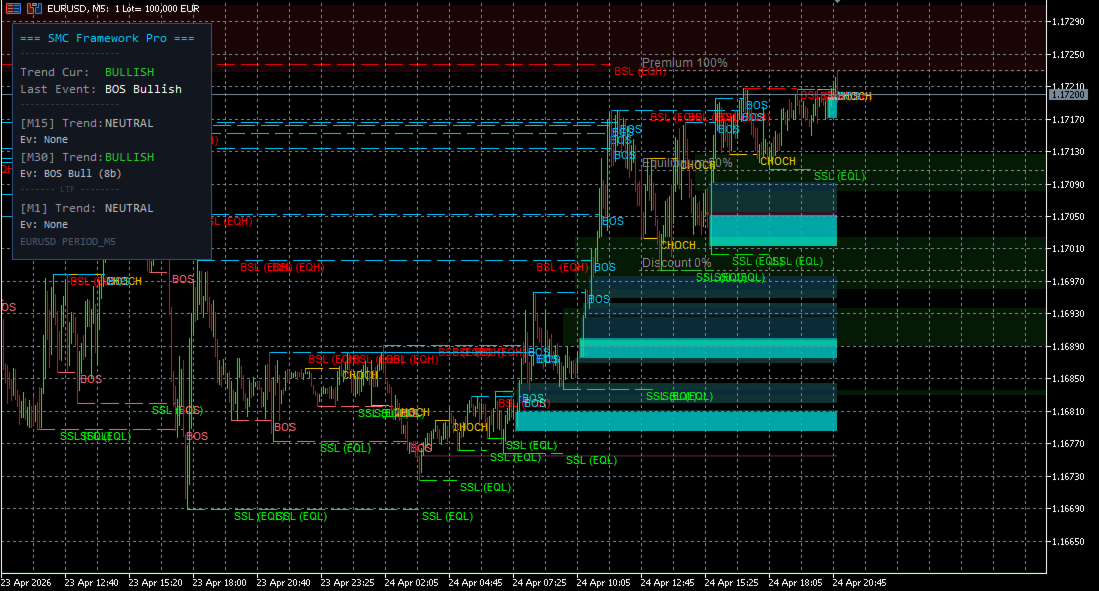 SMC Framework Pro is a technical analysis indicator developed for the MetaTrader 5 platform. It integrates multiple tools commonly associated with Smart Money Concepts (SMC) into a single environment, focusing on the visualization of price action, market structure, and selected price patterns.