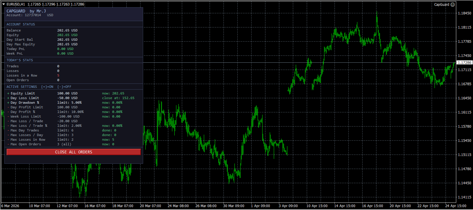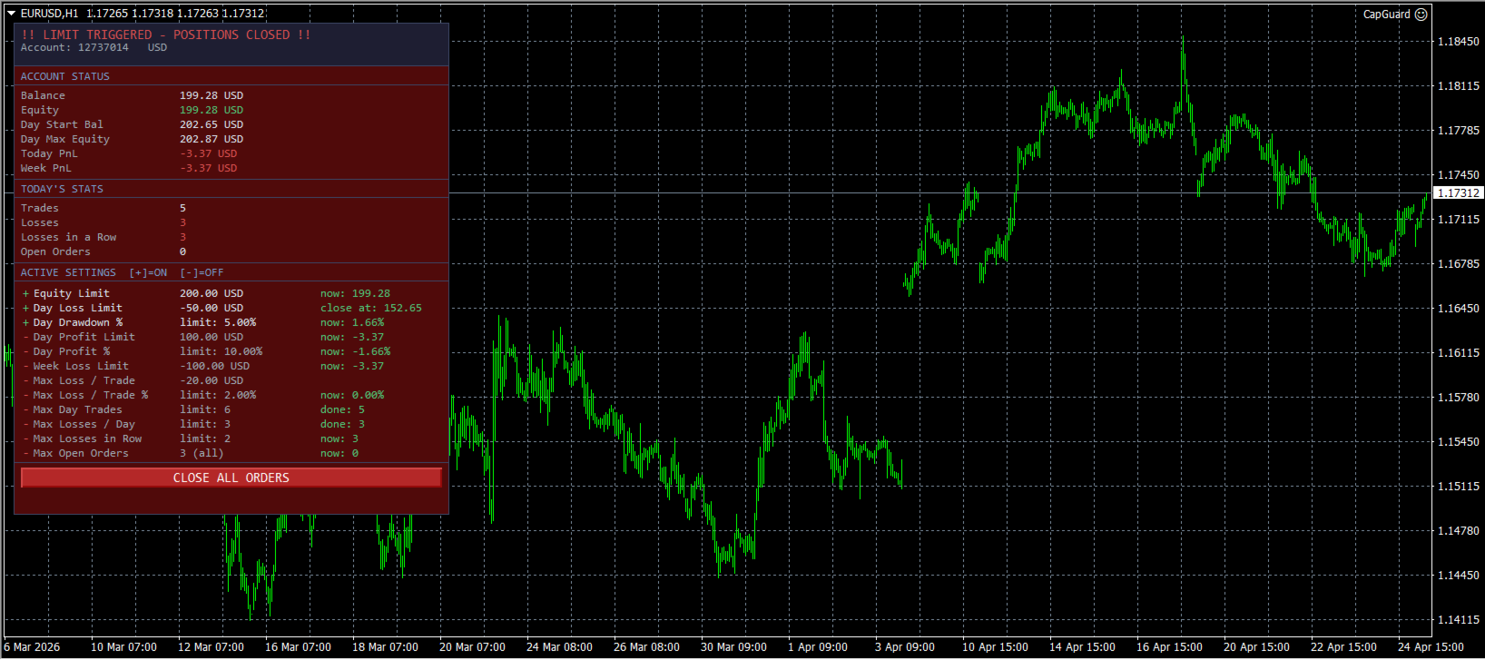 CapGuard watches your account 24/5 and automatically closes all open orders when any of your predefined risk limits are hit. It works alongside any other EA or manual trading style.