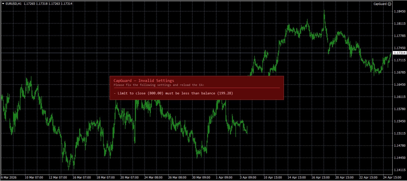 - Works alongside any trading EA — just attach CapGuard to any chart