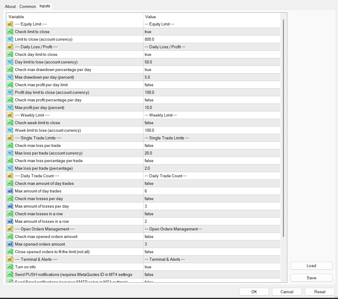 | Close terminal after limit overrun | false | Automatically close the MT4 terminal after all positions have been closed due to a limit breach. Use with caution — only enable if you want MT4 to shut down completely after a trigger event. |