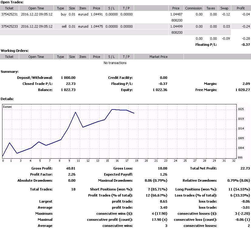 I run this EA on EURUSD M15 to 2016.12.09, and trades on, with the default settings. Here are the preliminary results of trading: