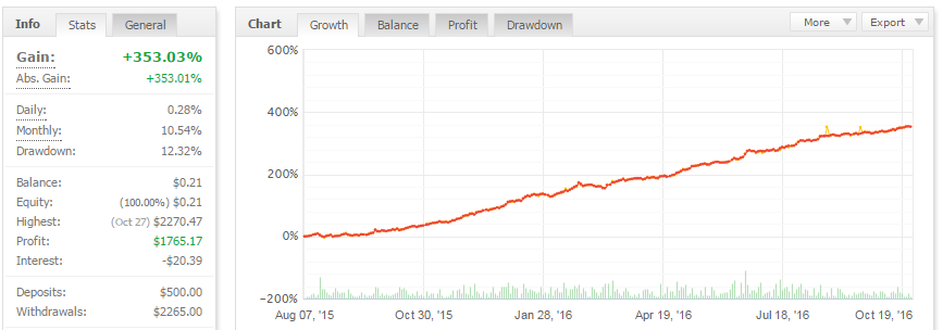 The system worked from August 2015 till October 2016 on the screenshot. Now EA trade with others 3 Expert on the general account.