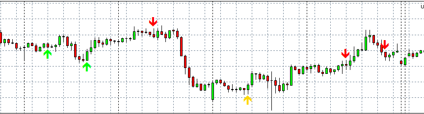 3. И по крестику стоп-лосс закрытия. Можно вместо него ставить более информативные стрелки о закрытии позиции? Например, для закрытия убыточной продажи после сработки ТП1 и не сработки ТП2 - вместо крестика поставить стрелку вниз острием в 3 мм от High сигнальной свечи. Цвет сделать Gold - как на скриншоте.
