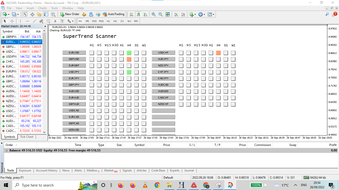 E.g. if you want to get an alert when EURGBP changes from red to green then you need to press the button which is defined in the row EURGBP and in the column H1 as shown in the following screenshot: