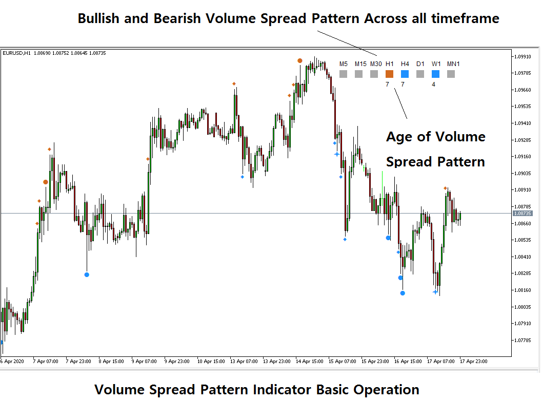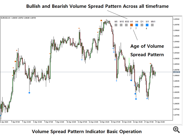 In the new version, it provides the age of bullish and bearish volume spread patterns across different timeframe. This will help you to complete your volume spread analysis across all timeframe.