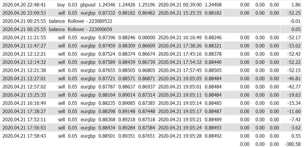 Indeed, the expert opened too much loosing trades in the EURGBP chart (about 14 trade) even in the morning. Moreover, the expert was always opening a new trade after trade is closed by the stop loss (-85 pips).