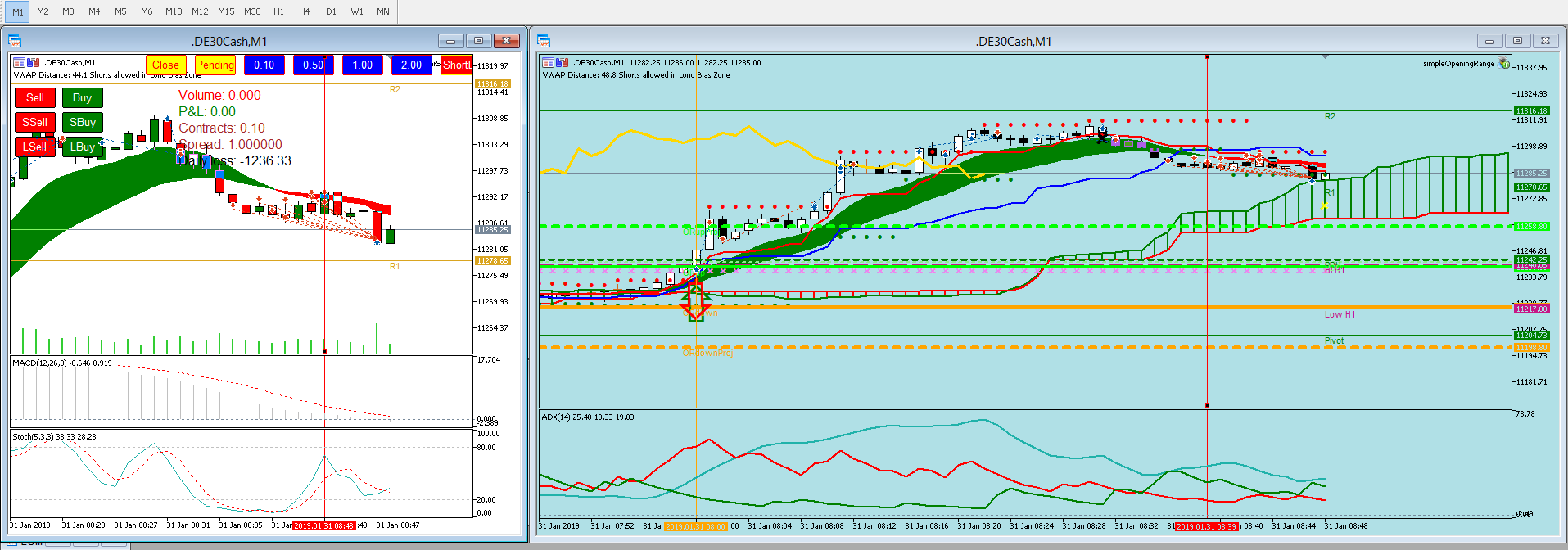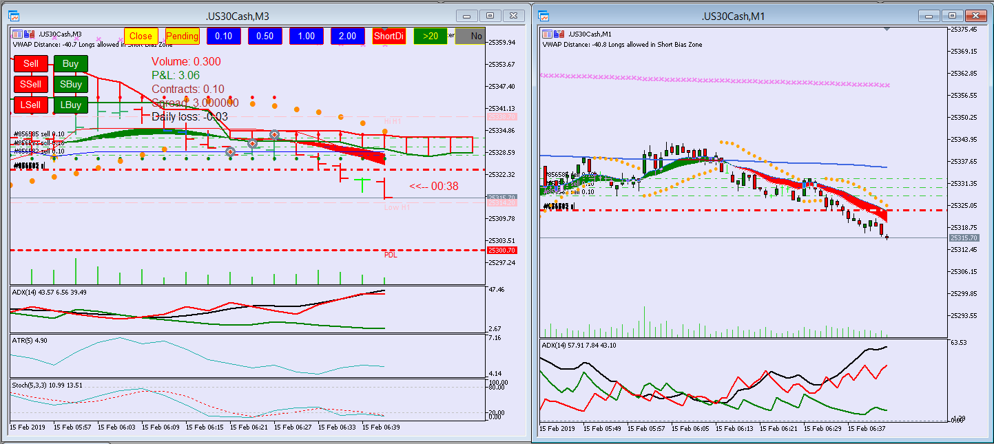 Linda Raschke says to sell at the first rebound of a trend when ADX (M5) is over 30. On the right there is adx (m3) over 40. With the Faster Shark tool you klick "LSell" for limit sell to get a good price. You also see that Di+ and Di- lines (red and green lines) in the ADX indicator diverge. This is a good sign for a strong downtrend.