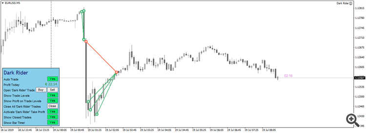 Set to No to deactivate the virtual take profit. Sometimes a retrace at London open or New York open happens in the direction of open 'Dark Rider' trades. You could deactivate the virtual take profit en close all trades by clicking the appropiate button. This is advanced use.