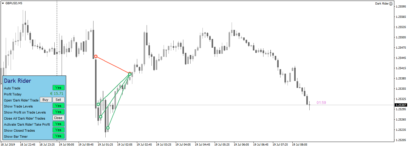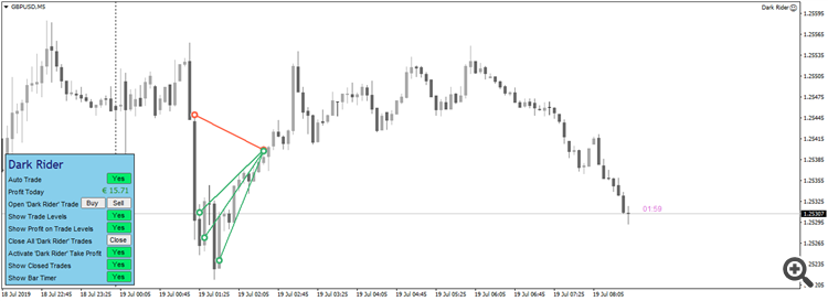 Opens a Buy or Sell trade with Dark Rider lot size, stoploss and virtual take profit. This allows you to open a (scalping) trade semi-manually outside the robots own automated trades.