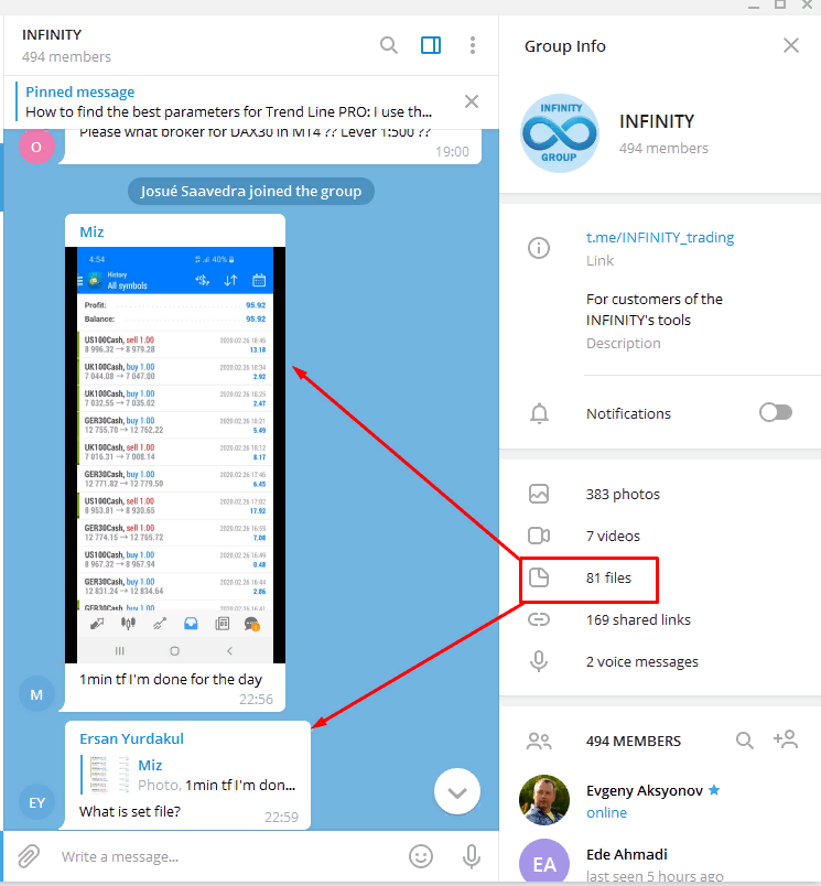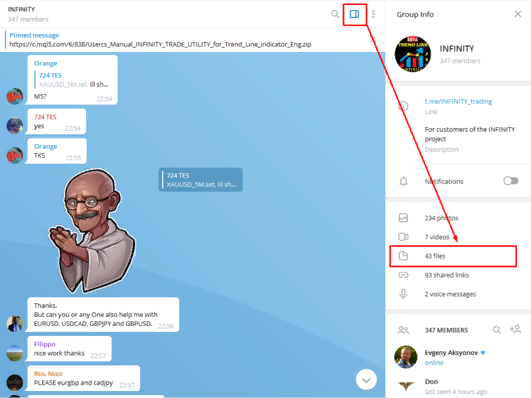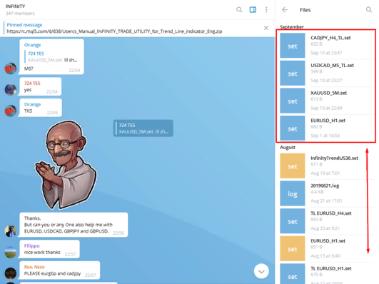 All your set files and recommendations are easy to find, for this open the side window of our group in TM-messenger and select the files folder: