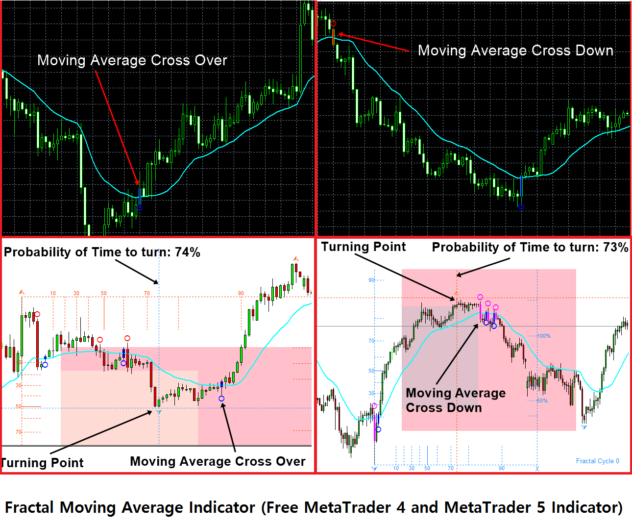 In fact, this indicator was built as the part of Fractal Pattern Indicator to save some computation. Anyway this indicator is distributed for free. Hence, every Metatrader 4 and MetaTrader 5 users can use this free Fractal Moving Average Indicator. This indicator will provide you moving average cross over and moving average cross down signals.