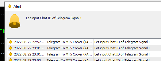 Hi, I have a problem, when I try to attach the EA to a chart it always pops out an alert saying: Let input Chat ID of Telegram Signal !
