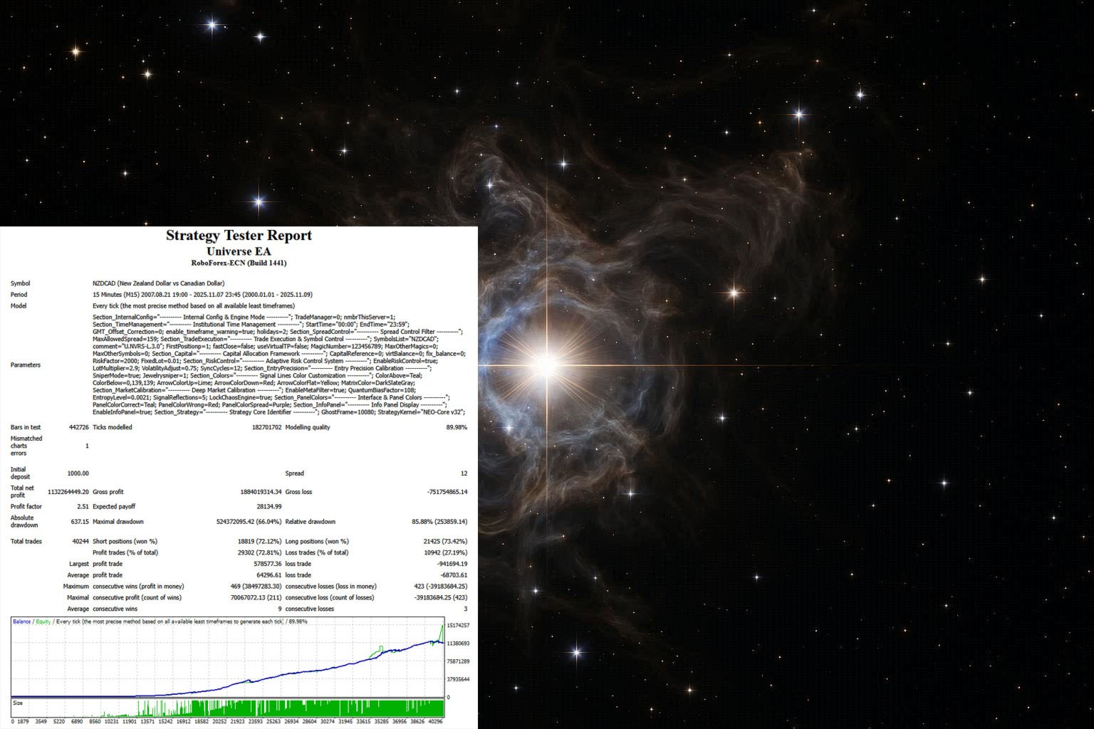 Universe EA önceden tanımlanmış kurallara göre piyasayı analiz eder, sinyaller üretir ve koşullar sağlandığında işlemleri açar. Sermaye yönetim mekanizmaları riski belirlenen sınırlar içinde tutmaya ve istikrarlı çalışmayı sağlamaya yardımcı olur.