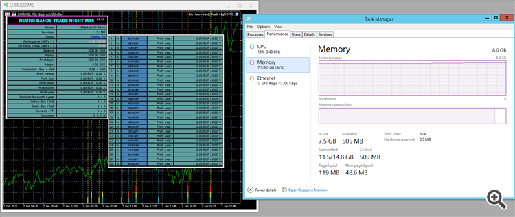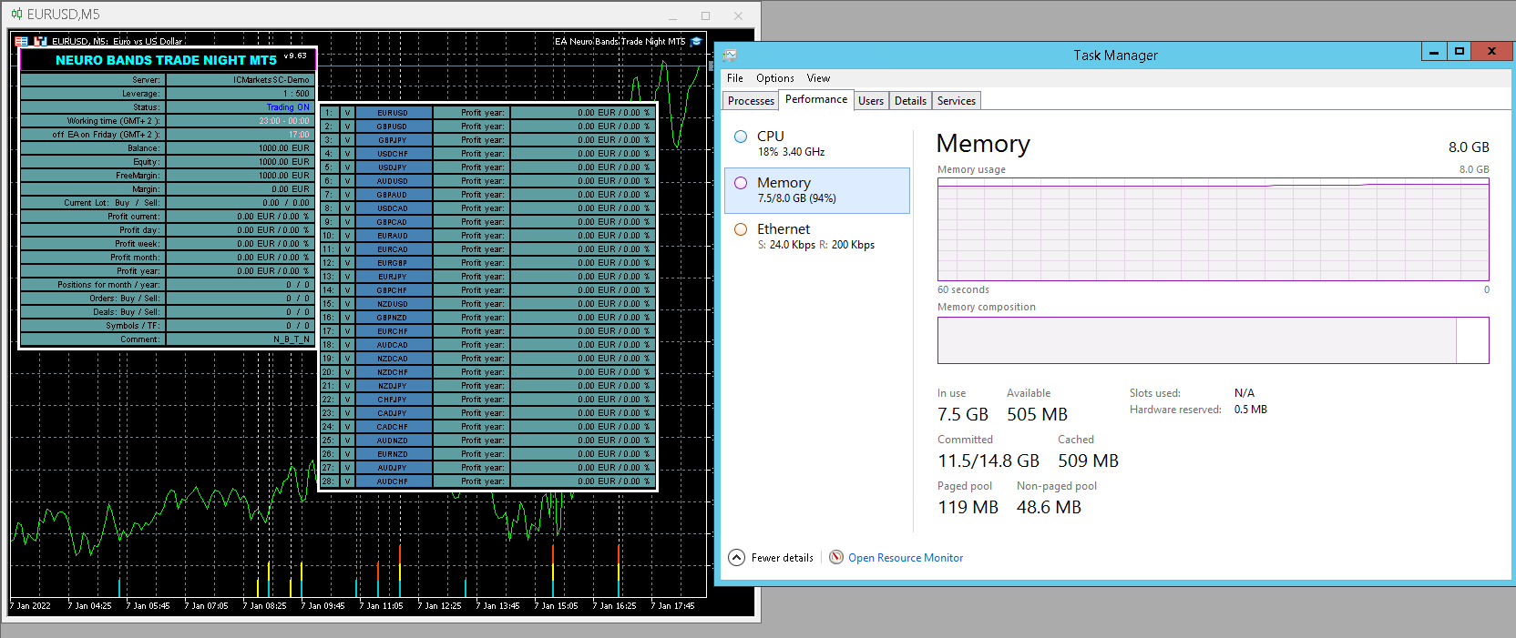 I tried to run the EA on my VPS. The same has 8 GB of RAM and 4 cores with each 3,4 GHZ.