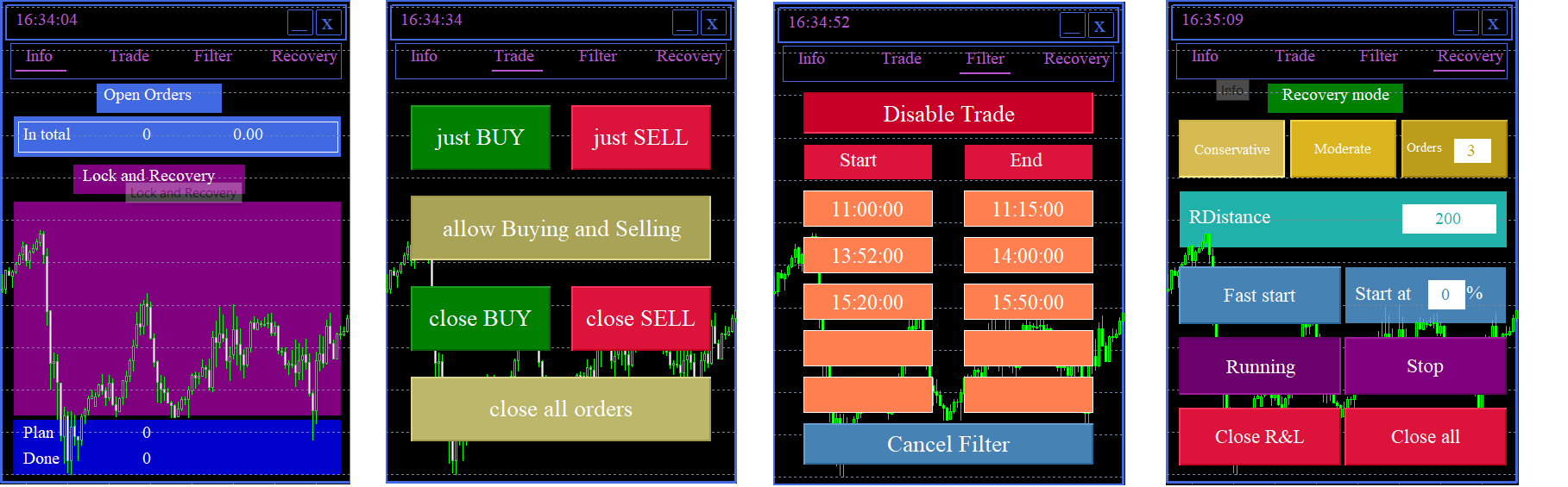 4. Start at % - Once negative floating DrawDown gets to a set % - the recovery system will initiate. After setting the desired % value, user has to press the “Running” button to launch the updates parameters