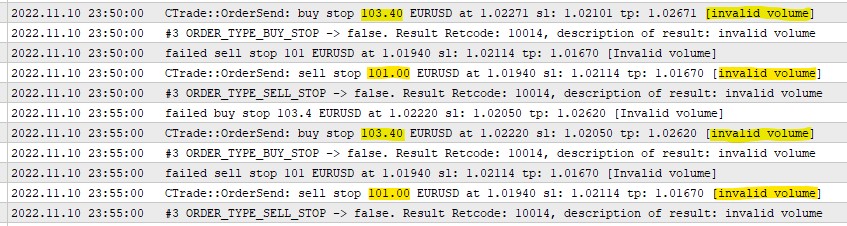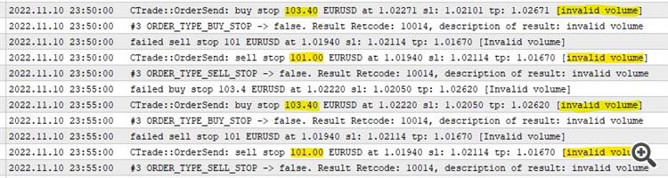 My broker uses max volume per trade of 100 or 500 lots. When AUTOLOT is used the lot size overflows the 100 or 500 (lot size) max volume limit per trade. See the image below.