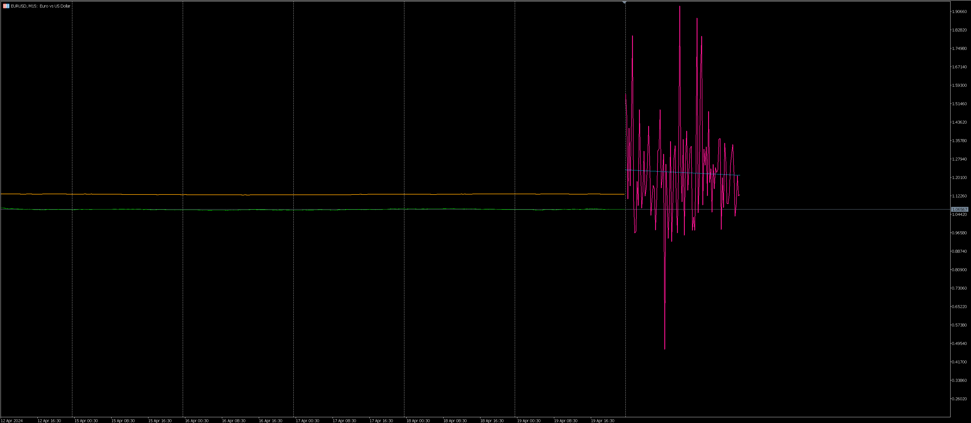 The point is that the yellow line is NOT missing. It is there but on the screenshot you can not see it because of the chart scale. Please check the next screenshot where i used an extreme chart scale to make everything visible. As you see on the screenshot below in the middle we have the "squeezed" price data (because of the chart scale) and you also see the pink forecast data with HUGE swings up and down and you can also see the blue regression line and the yellow line. So everything is there but the data is useless obviously.