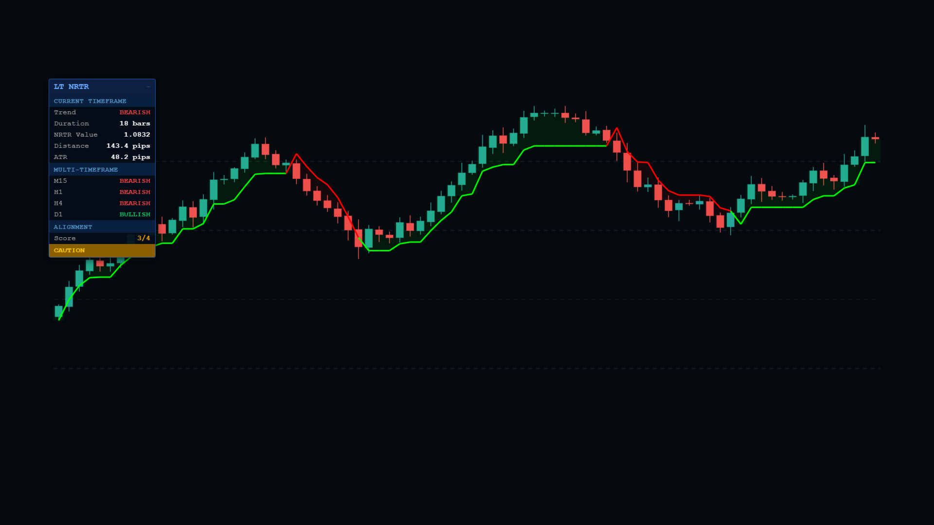 2. Takip Eden Stop: NRTR aynı zamanda trend olan piyasalarda karları korumak için güvenilir bir takip eden stop aracı olarak da kullanılır. Fiyat istenilen yönde hareket ettikçe, NRTR hattı fiyatın altında veya üstünde dinamik olarak takip eder ve böylece uygun bir stop-loss seviyesi sunar.
