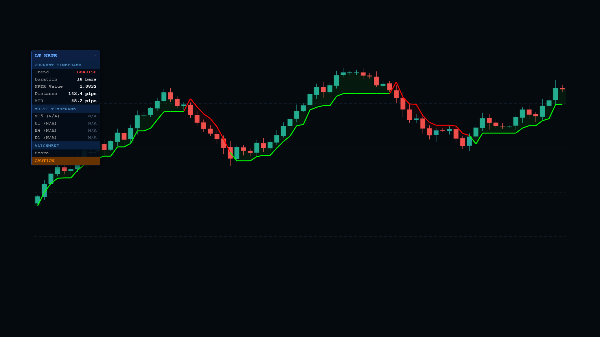 1. Eğilim Değişimleri: NRTR göstergesi, bir eğilimin değişmesinin olası olduğu durumlarda net sinyaller üretir. Gösterge hattının fiyat grafiği üzerinde kesişmesine dikkat edin, bu eğilim yönünde olası bir değişikliği gösterir.